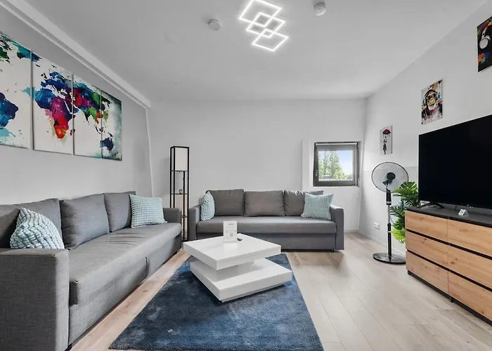 The spacious Dg - Einfach Aber Sehr Komfortabel - Wohnung Fuer Bis Zu 12 Personen - Gruppen, Messe, Monteure, Studenten - Voll Ausgestattet - 3 Smart-Tv 55 Zoll Netflix, 1000 Mbit Wlan, Voll Ausgestattete Kueche Duisburg is a great place to stay in the Ruhrort district, 4.9 km from the established Duisburg Zoo. Wi-Fi is available for guests' business or leisure needs.